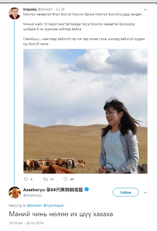 “Монгол нөхөртэй япон бүсгүй Кикүчи ЭрикаМонгол бvсгvйчvvдэд хандан: Жаахан царай, амт муутай болохоос биш бууз, цуйван хийчихнэ ээ …. Юуны ѳмнѳ Монголын ард түмэн болон эрчүүдэд нь мэнд хүргье. Би Япон улсын иргэн 27н настай. Эдийн засагч мэргэжилтэй. Би Монгол нѳхѳртэй болсон нь үнэхээр аз болсон юм. Учир нь би Японд Япон залуутай гэрлэнэ гэвэл яг л роботтой амьдарч байгаам шиг л насыг барах байсан байх. Япон эрчүүд пиво уугаал гэртээ байх нь л ѳѳрт нь тааламжтай. Харин Монгол эрчүүд тэгдэггүй ажил олдвол аль цалин ѳндѳртэй рүү нь тэмүүлдэг. Энэ зан чанар нь надад таалагдсан. Манай нѳхѳр надтай байнга дотно ярилцаж хамтдаа хоол хийж их хѳгжилтэй байдаг энэ бүхэн надад таалагддаг. Би нѳхрийнхѳѳ талаар ярихад манай нѳхѳр аялал жуулчлалын хѳтѳч мэргэжилтэй хүн. Бид хоёр анх Монгол улсад Улаанбаатар хотоос багагүй зайтай Тэрэлжийн цогцолборт анх танилцаж байсан юм. Нѳхѳр маань ѳнгѳрсѳн амьдралдаа сэтгэл дундуур ярих их дургүй байдаг. Гэхдээ би нэг удаа яриулж байсан. Нѳхѳр маань ѳмнѳ Монгол эхнэртэй байсан юм байна лээ. Нѳхѳр маань мѳнгѳ олно олсон мѳнгѳѳрѳѳ архи уучдаг архины хамааралтай байсан болхоор ѳмнѳх эхнэр нь хаяаад явсан гэсэн. Надтай танилцахдаа ч бас хамт Японд амьдардаг болсон хойноо ч архи жаахн уучдаг байсан. Харин би нѳхрѳѳ зассан би түүнийг зоригжуулж байлаа. Чи чадах болно үүнийг давж чадна чи үүнийг ялах ёстой би чамдаа итгэж байна гэж зоригжуулдаг байсан. Тиймээ нѳхѳр маань чадсан. Архинаас бүрэн гарсан. Миний нѳхѳр их ажилсаг хүн л дээ одоо бол ѳѳрѳѳ ачлалын компанитай Монгол Японы хооронд аялал зохион байгуулдаг. Одоо бид сайхан амьдарч байна. Сүүлийн үед Монгол залуустай гэрлэх Япон охидын тоо нэмэгдэж байгаад сэтгэл хангалуун байна. Миний найз 10 гаруй эмэгтэй байдаг бүгд Монгол нѳхѳртэй болохоор шийдэж 6 нь хуримаа хийгээд байна. Эцэст нь хэлхэд хүчирхэг эр хүний ард түүнийг удирдагч нэгэн бүсгүй байдаг гэдэг. Би нѳхрийнхѳѳ ѳмнѳх эхнэрт хандаж хэлхэд түүнийг засаж авч чадаагүй хаясанаараа чи алдаж харин би засаж авсанаараа азтай байна. Уг нь бүх Монгол залуусыг бидэнд ѳгчвѳл засаж сургаж авч хайрлаад сайхан байна даа (инээв). За эцэст нь бүх хосууд аз жаргалтай сайхан амьдараасай гэж хүсье“