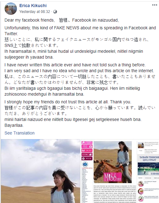 Монгол нөхөртэй япон бүсгүй Кикүчи Эрика гэх бүсгүйн талаарх мэдээлэл цахим орчинд нилээдгүй тархаж олны анхааралд хүрээд байгаа юм. Тэгвэл уг мэдээлэл ямар ч үндэслэлгүй худал мэдээлэл гэдгийг Кикүчи Эрика мэдэгджээ.
