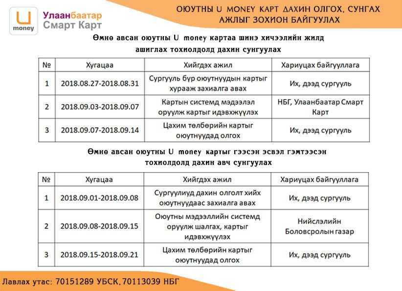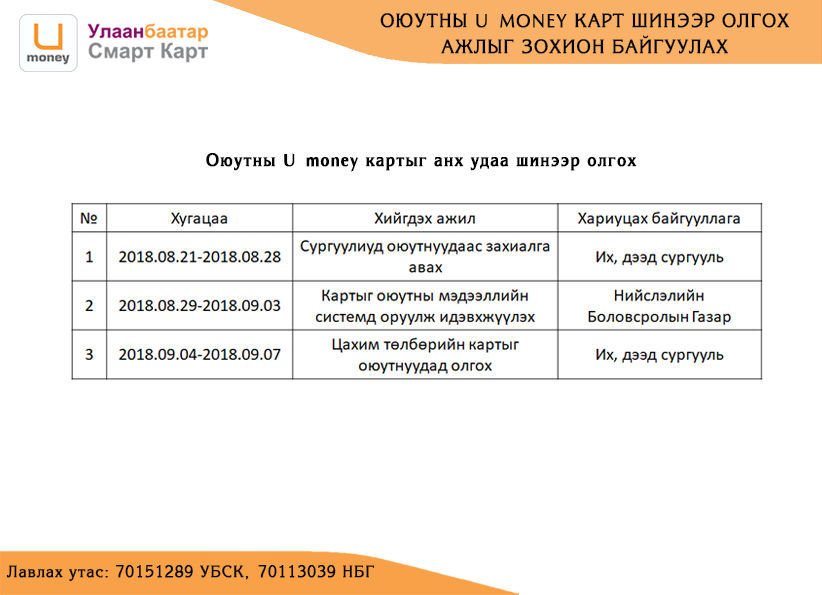 - 2017-2018 оны хичээлийн жилд болон түүнээс өмнө нийтийн тээврээр хөнгөлөлттэй зорчих цахим төлбөрийн карт авсан, 2018-2019 оны хичээлийн жилд дахин ашиглах нөхцөлийг хангасан оюутнууд картаа сунгуулан ашиглана.