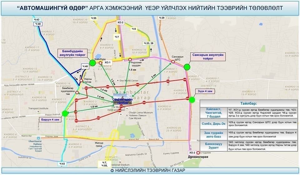 “Авто машингүй өдөр”-ийг зохион байгуулах үйл ажиллагааны хүрээнд Бага тойруу, Энхтайваны өргөн чөлөөний Баруун 4 замын уулзвараас Зүүн 4 зам хүртэлх авто зам, Сөүлийн гудамж, Бээжингийн гудамж, Анкарагийн гудамж, Сүхбаатарын гудамж, Их сургуулийн гудамж, Элчингийн гудамж, Партизаны гудамж, Олимпын гудамж Самбуугийн гудамжны автозамын хөдөлгөөнийг хязгаарлах тул эдгээр гудамж, замаар үйлчилгээ үзүүлдэг нийтийн тээврийн 40 чиглэлийн 340 тээврийн хэрэгслийн чиглэл, замналд өөрчлөлт орно.