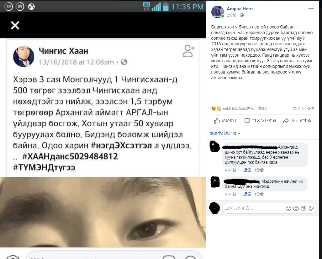 Тэрээр: “Баасан хэн ч билээ нэртэй нөхөр байсан санагдахын. Бас нэрэндээ дургүй байгаад солино солино гэхэд арай томруулчихсан уу үгүй юу? 2013 онд дэлгүүр нээе, алаад өгнө гэж надаас хэдэн төгрөг аваад буцааж өгөхгүй үгүй ээ мөн үйл там үзсэн нөхөрдөө. Ганц ганцаар нь хүнээс мөнгө аваад хаширчингуут 3 саяулангаас нь гуйж нтр. Нийгэмд энэ мэтийн солиорлыг дэмжиж буй нэлээд хүмүүс байгаа нь энэ нөхрөөс ч илүү эмгэнэл юмдаа” хэмээжээ.