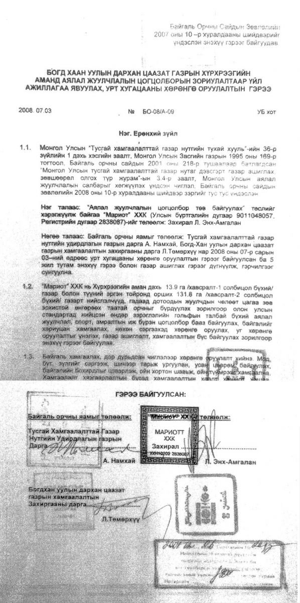 Дараа нь өдгөө шүүхээс буруутгасан 2008 оны долдугаар сарын 3-нд БО-08/А-09 тоот Богдхан уулын Дархан цаазат газрын Хүрхрээгийн аманд аялал жуулчлалын цогцолборын зориулалтаар үйл ажиллагаа явуулах урт хугацааны хөрөнгө оруулалтын гэрээг байгуулсан байна. Уг гэрээнд Байгаль орчны яамыг төлөөлж Тусгай хамгаалалтай газрын нутгийн удирдлагын газрын дарга А.Намхай, Богдхан уулын Дархан цаазат газрын хамгаалалтын захиргааны дарга Л.Төмөрхүү, “Мариотт” ХХК-ийн захирал, одоогийн УИХ-ын дэд дарга Лувсанцэрэнгийн Энх-Амгалан нар гарын үсэг зурж баталгаажуулжээ. Энд нэг зүйлийг тэмдэглэхэд УИХ-ын дэд дарга Л.Энх-Амгалан намтартаа “Мариотт” ХХК-ийн захирал байсан гэж оруулдаггүй нь анхаарал бас татна.