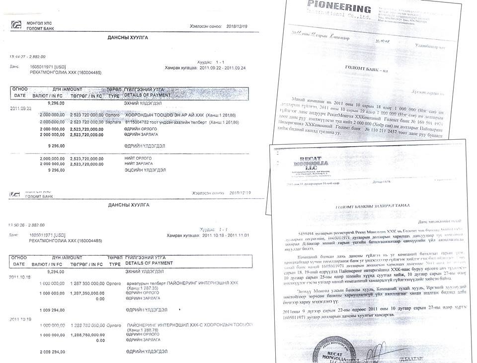 Мөн тус компанийн бичгээс өмнө “Голомт” банкинд Т.Ганболдын “Пайонеринг интернэшнл” ХХК-иас “Рекат Монголиа” ХХК-ийн дансанд андуурч шилжүүлсэн хоёр сая ам.долларыг буцааж шилжүүлнэ үү” гэсэн хүсэлт бас иржээ.