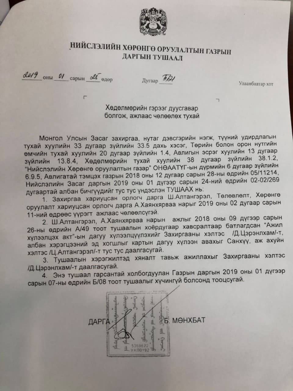 Түүний энэ үйлдэлд цалингаас нь суутгаж сахилгын арга хэмжээ аваад байсан билээ. Тэгвэл Нийслэлийн Хөрөнгө оруулалтын газрын Хөрөнгө оруулалт, төлөвлөлт хариуцсан орлогч дарга А.Хаянхярвааг хоёрдугаар сарын 11-ний өдрөөр үүрэгт ажлаас нь чөлөөлөх шийдвэрийг өнгөрсөн баасан гарагт гаргасан талаараа НХОГ-аас өнөөдөр Нийслэлийн Засаг дарга бөгөөд Улаанбаатар хотын захирагчийн албан үүргийг түр орлон гүйцэтгэгч Ж.Батбаясгаланд албан бичиг хүргүүлсэн байна.