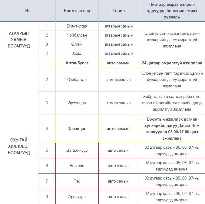 “Хилийн боомт тэдгээрийн дэглэмийн тухай” Монгол Улс, БНХАУ-ын Засгийн газрын 2004 оны хэлэлцээрийн 4.3-т заасны дагуу хилийн боомтууд амарна.