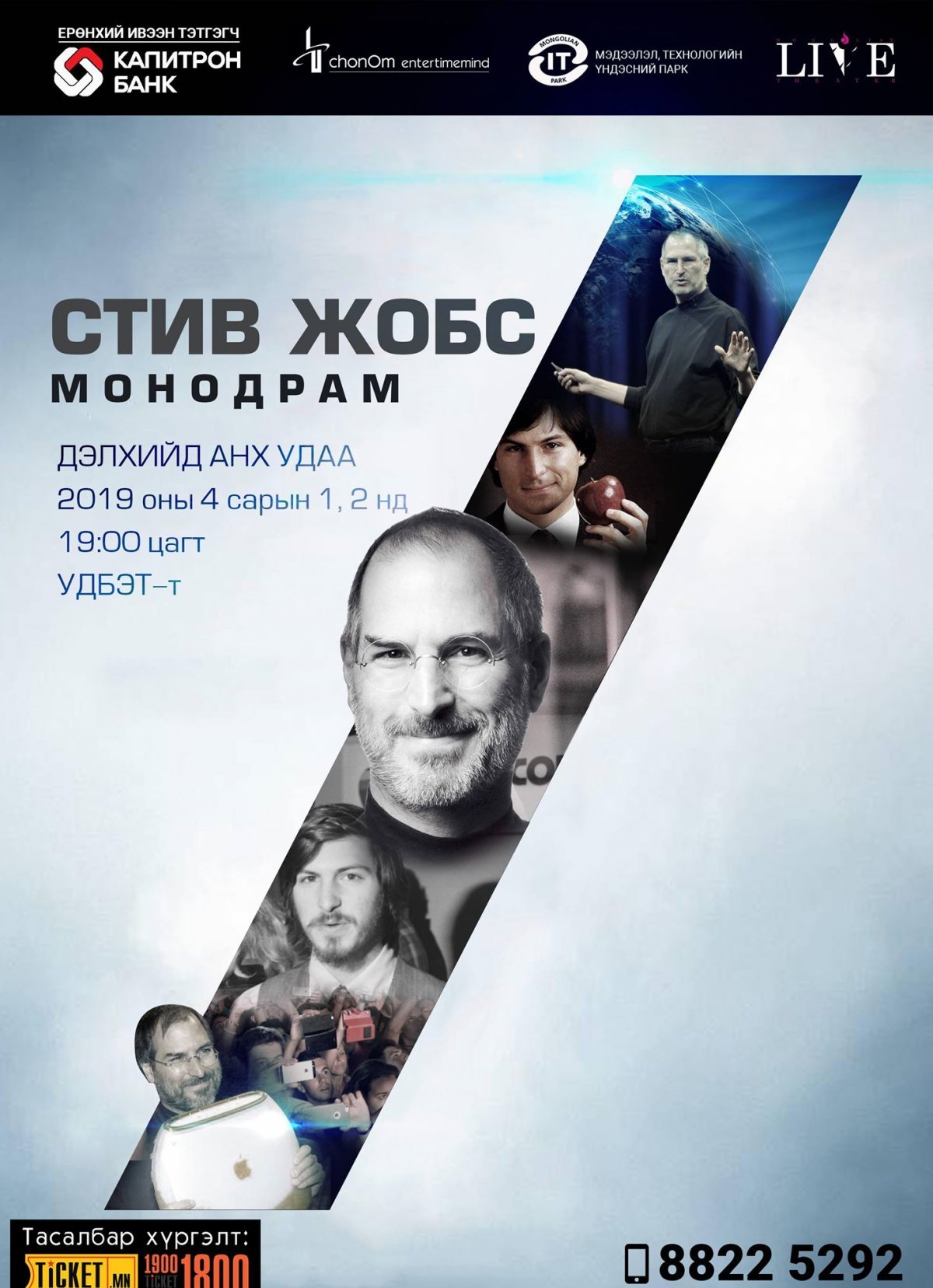 Дэлхийн анхны ИХ НАЯД ДОЛЛАРЫН компанийг үүсгэн байгуулагч, шилдэг энтрепренёр Стив Жобсын хувь хүний онцлог, зан төрх, бүтээлч байдлыг таниулах дэлхийд анх удаа хийгдэж буй “Стив Жобс” Монодрам жүжиг УДБЭТ-т 4 сарын 1,2-нд тоглогдоно. Найруулагч болон гол дүрийг бүтээж буй жүжигчний нэрийг нууцалж буй юм.