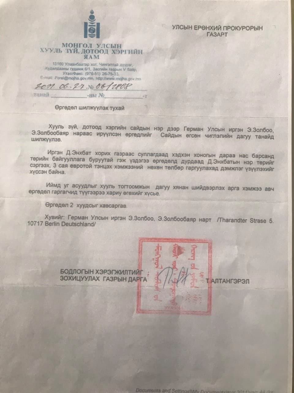 Тэд уг өргөдөлдөө, Бидний аав Д.Энхбатад хилс хэрэг тулган амь насыг хохироосон тул эл хэрэгт холбогдох хүмүүсийг тогтоож, аавын минь нэр төрийг сэргээж өгөхийг хүсчээ. Тухайн үед Д.Энхбат агсны үр хүүхдүүд нь хууль хяналтын байгууллагуудад шат дараалан өргөдөл гаргаж байсан удаатай. Гэвч тэдний өргөдлийн хариу огт өгдөггүй байжээ. Тиймээс талийгаачийн үр хүүхэд, ар гэрийнхэн, төрөл төрөгсөд нь олон улсын парламентын холбоонд өргөдөл гаргахаар болсон байна.