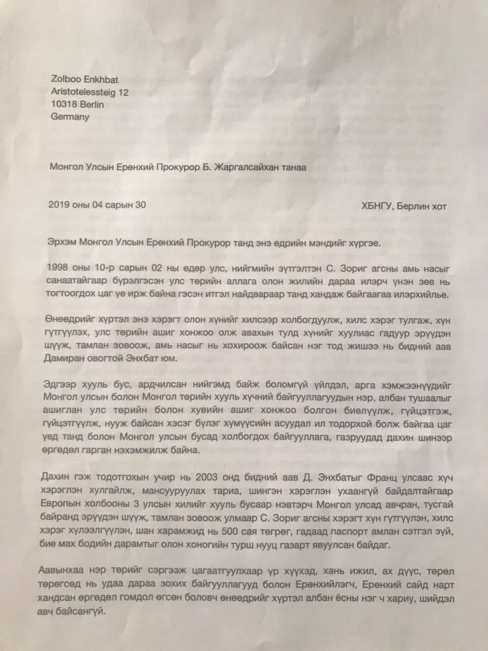 Түүнийг хулгайлж авчран эрүүдэн шүүсэн ч, С.Зоригийн аллагыг үйлдсэн этгээд болгож чадаагүй учраас Улсын нууц задруулсан гэх хэргээр ялтан болгосон гэж өмгөөлөгч нь мэдэгдэж байсан билээ. Тэгвэл түүний хүүхдүүд болох Э.Золбоо, Э.Золбообаяр нар улсын ерөнхий прокурор Б.Жаргалсайханд хандан өргөдөл гаргажээ.