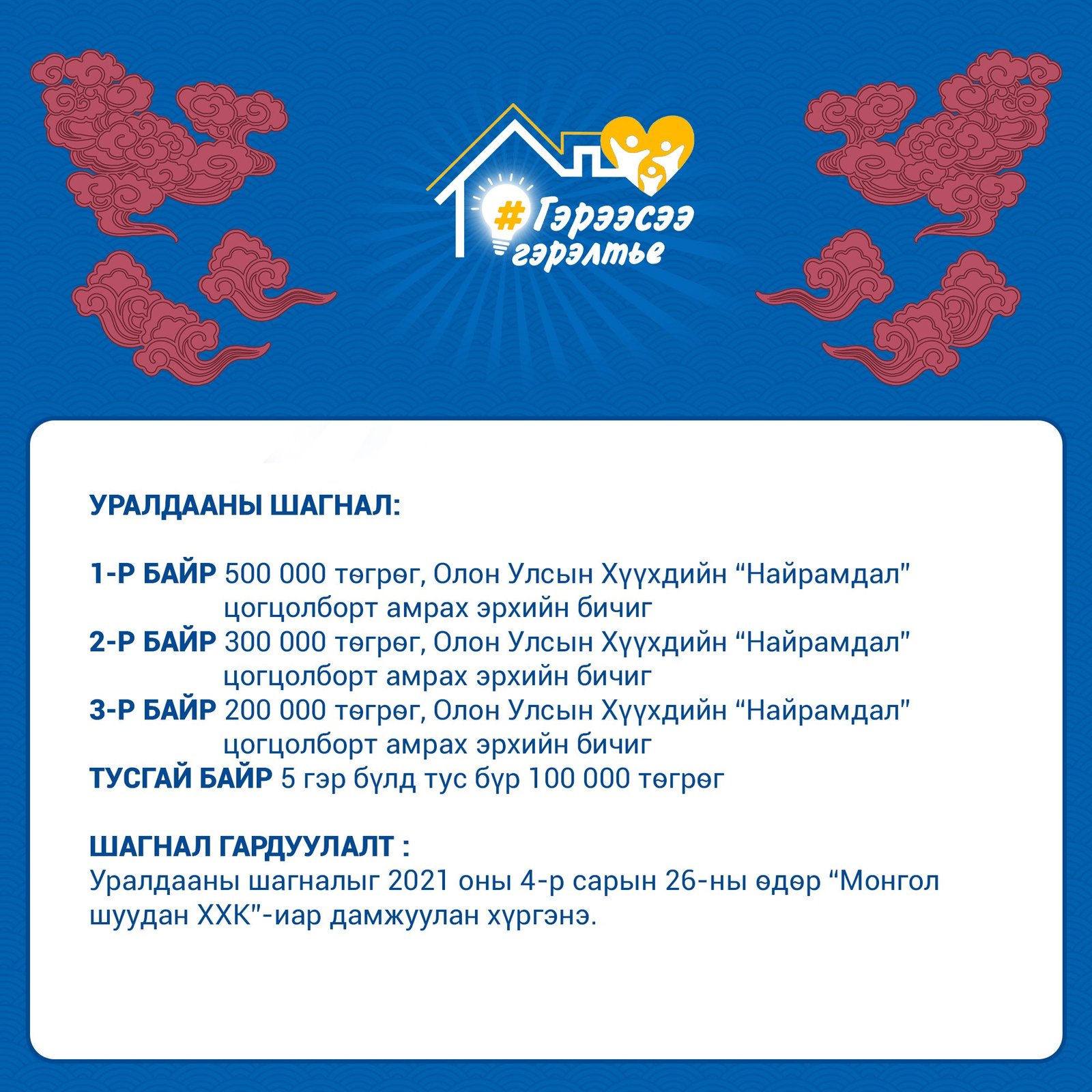 Like, share хийсэн байх ШАЛГАРУУЛАЛТ:Уралдаанд оролцож буй гэр бүлүүд “Үлгэр уншсан бичлэг”-ээ овог нэр, холбоо барих утас, гэрийн хаяг мөн Фэйсбүүк, цахим орчинд байршуулсан линкээ 2021 оны 04 дүгээр сарын 24-ний өдрийн 17:00 цагийн дотор Засгийн Газрын хэрэгжүүлэгч Агентлаг Гэр бүл, хүүхэд, залуучуудын хөгжлийн газрын info@fcy.gov.mn хаягаар ирүүлнэ.Уралдаанд ирүүлсэн бүтээлийн лайк, шэйр хандалтын тоо болон ажлын хэсгээс гарсан үнэлгээгээр шалгаруулна. ШАГНАЛ:1-Р БАЙР 500,000 төгрөг, Олон Улсын Хүүхдийн “Найрамдал” цогцолборт амрах эрхийн бичиг2-Р БАЙР 300,000 төгрөг, Олон Улсын Хүүхдийн “Найрамдал” цогцолборт амрах эрхийн бичиг3-Р БАЙР 200,000 төгрөг, Олон Улсын Хүүхдийн “Найрамдал” цогцолборт амрах эрхийн бичигТУСГАЙ БАЙР 5 тус бүр 100,000 төгрөг ШАГНАЛ ГАРДУУЛАЛТ:2021 оны 04 дүгээр сарын 26-ны өдөр шагналыг Монгол шуудан ХХК-иар хүргүүлнэ.Үлгэрч гэр бүлд Үлгэр жишээ хүүхэд өснө Та бүхэн идэвхтэй оролцоорой