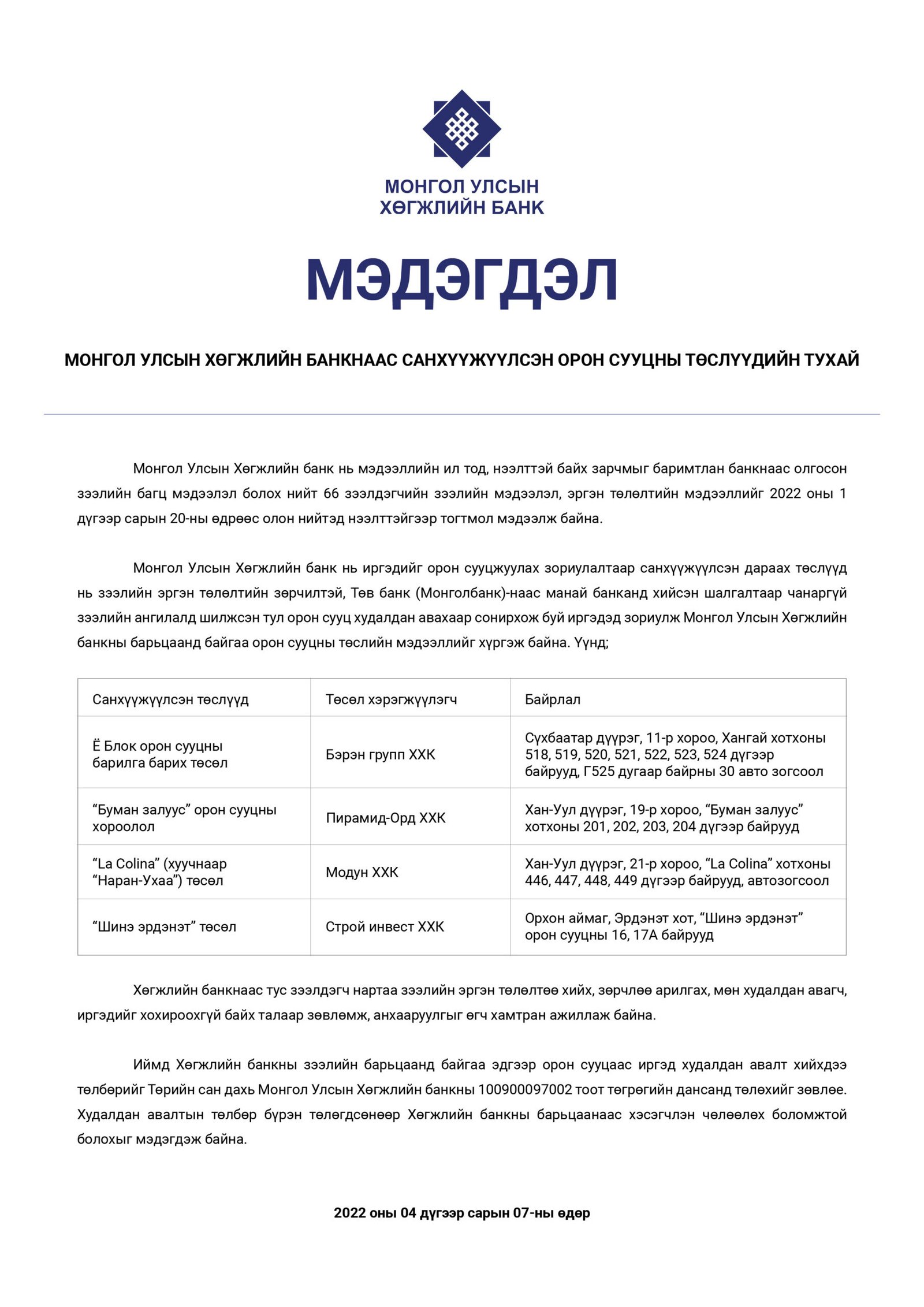 Хөгжлийн банкны барьцаанд байгаа орон сууцуудын талаарх мэдэгдлийг иргэдэд зориулж мэдээлсэн. Энэ талаар та дэлгэрэнгүй мэдээлэл өгөхгүй юу?