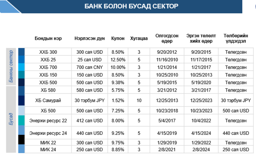 Банкуудаас “TDB-300”, “TDB-25”, “TDB-700”, “TDB-150”, “TDB-500” гэсэн 5 бонд, Монгол Улсын Хөгжлийн банк “Хөгжлийн банк-580”, “Самурай”, “Хөгжлийн банк-500” гэсэн 3 бонд, бусад ААН, байгууллагаас “Энержи ресурс-22”, “Энержи ресурс-24”, “МИК-22”, “МИК-24” гэсэн 4 бондыг олон улсын зах зээлд тус тус гаргажээ.