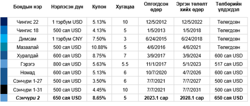 Манай улсын Засгийн газраас олон улсын хөрөнгийн зах зээлд “Чингис-18”, “Чингис-22”, “Димсан”, “Мазаалай” болон “Хуралдай”, “Гэрэгэ”, “Номад”, ““Сentury-1”, “Сentury-2” гэсэн нийт 9 бонд гаргажээ.