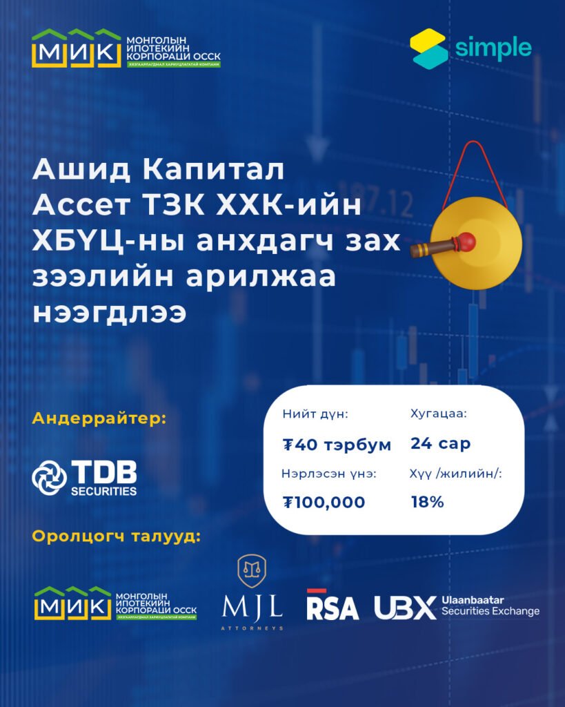 “Ашид Капитал ББСБ” ХХК нь “Ашид Капитал Ассет ТЗК” ХХК-иараа дамжуулан 40.0 тэрбум төгрөгийн автомашины фидуци (Үүргийн гүйцэтгэлийг хангуулахаар эд хөрөнгө өмчлөлд шилжүүлэх гэрээ) бүхий зээлийн хөрөнгөөр баталгаажсан үнэт цаасыг 18 %-ийн хүүтэйгээр гаргаж байгаа бөгөөд “МИК ОССК” ХХК нь тус үнэт цаасны хөрөнгө итгэмжлэн удирдагчаар ажиллаж байна.