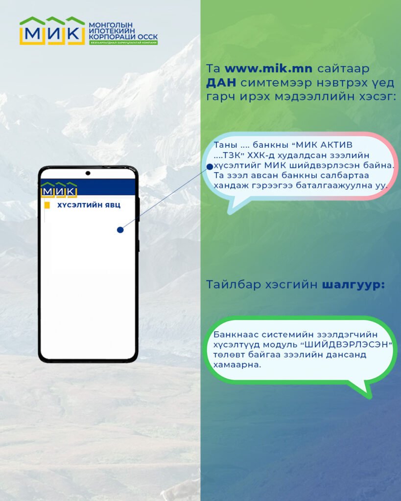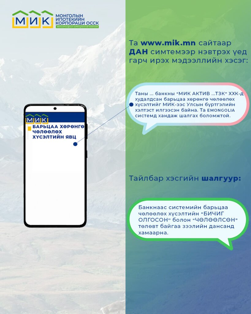- МИК-д шилжсэн эсэх. Тухайн орон сууцны зээлийг Банкнаас МИК-д худалдсан эсэх мэдээллийг энэ хэсгээс харах боломжтой.
