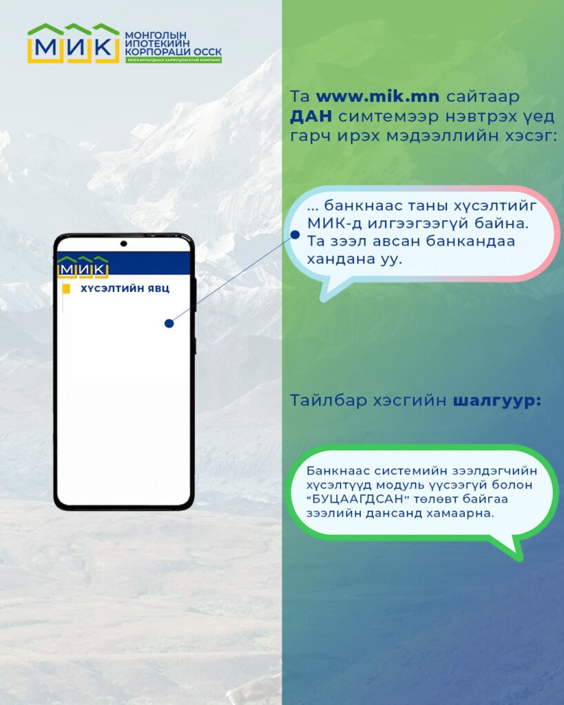 МИК-д худалдсан болон худалдахаар хүлээгдэж байгаа талаарх мэдээллийг иргэд www.mik.mn сайт хандаж “Иргэд олон нийт” цэсний “Ипотекийн зээлийн мэдээлэл авах” хэсгээс “ДАН” танилт нэвтрэлтийн нэгдсэн системээр дамжуулан дараах 3 төрлийн мэдээллийг авах боломжтой боллоо.