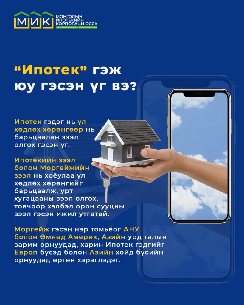 Орон сууцны ипотекийн зээл гэдэг нь бүрэн баригдаж дууссан, Улсын комисс ашиглалтад хүлээж авсан, Улсын бүртгэлд бүртгэгдсэн, үл хөдлөх эд хөрөнгийн гэрчилгээгээр баталгаажсан, орон сууцны зориулалттай үл хөдлөх эд хөрөнгө барьцаалсан зээлийг хэлнэ.